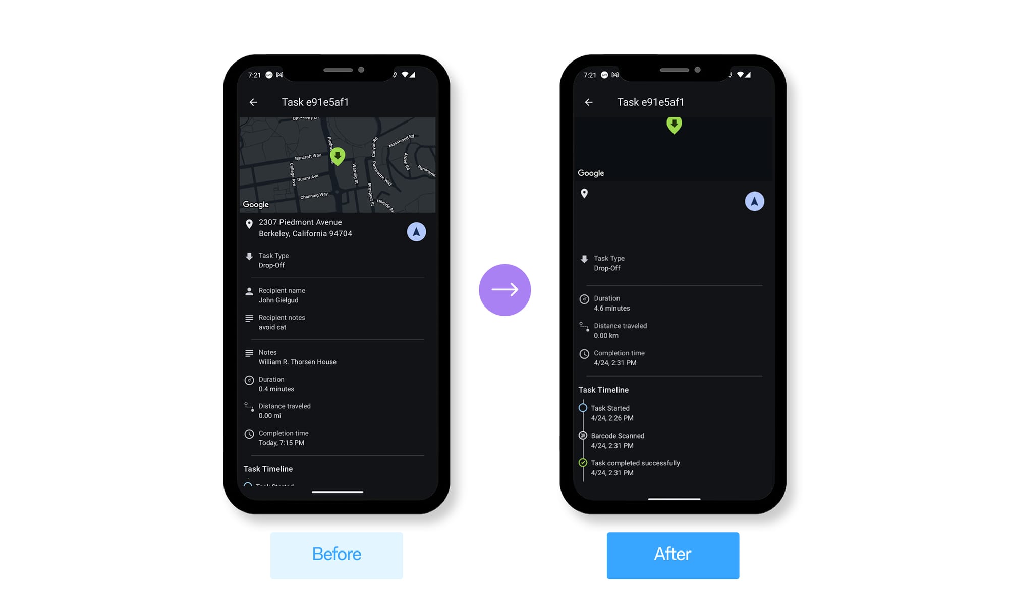Drivers can access key recipient details, like name and address, for navigation and communication purposes while the task is in progress. Once completed, the recipient's personally identifiable information can be hidden from the driver’s task history to improve customer privacy.