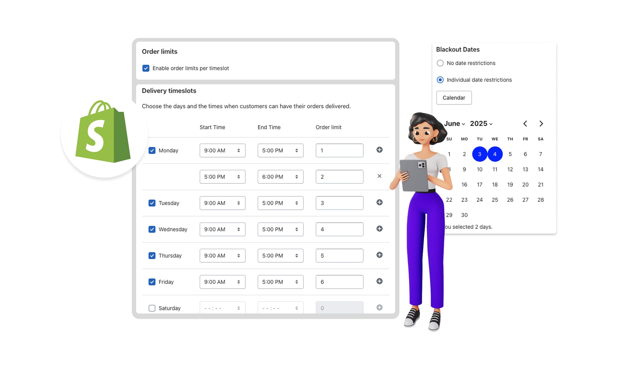 Gain greater control over your delivery operations with new configuration options in Shopify. You can now set order limits by location and time slot to prevent overbooking and define blackout dates to block off days when deliveries shouldn’t be scheduled.
