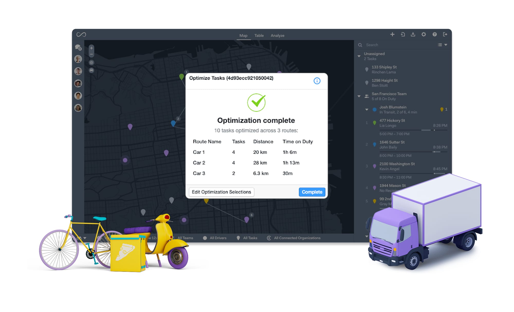 - Scale & Enterprise: Optimize routes for multiple vehicle types simultaneously. For example, Tasks can be routed across Trucks and Motorcycles in a single optimization.