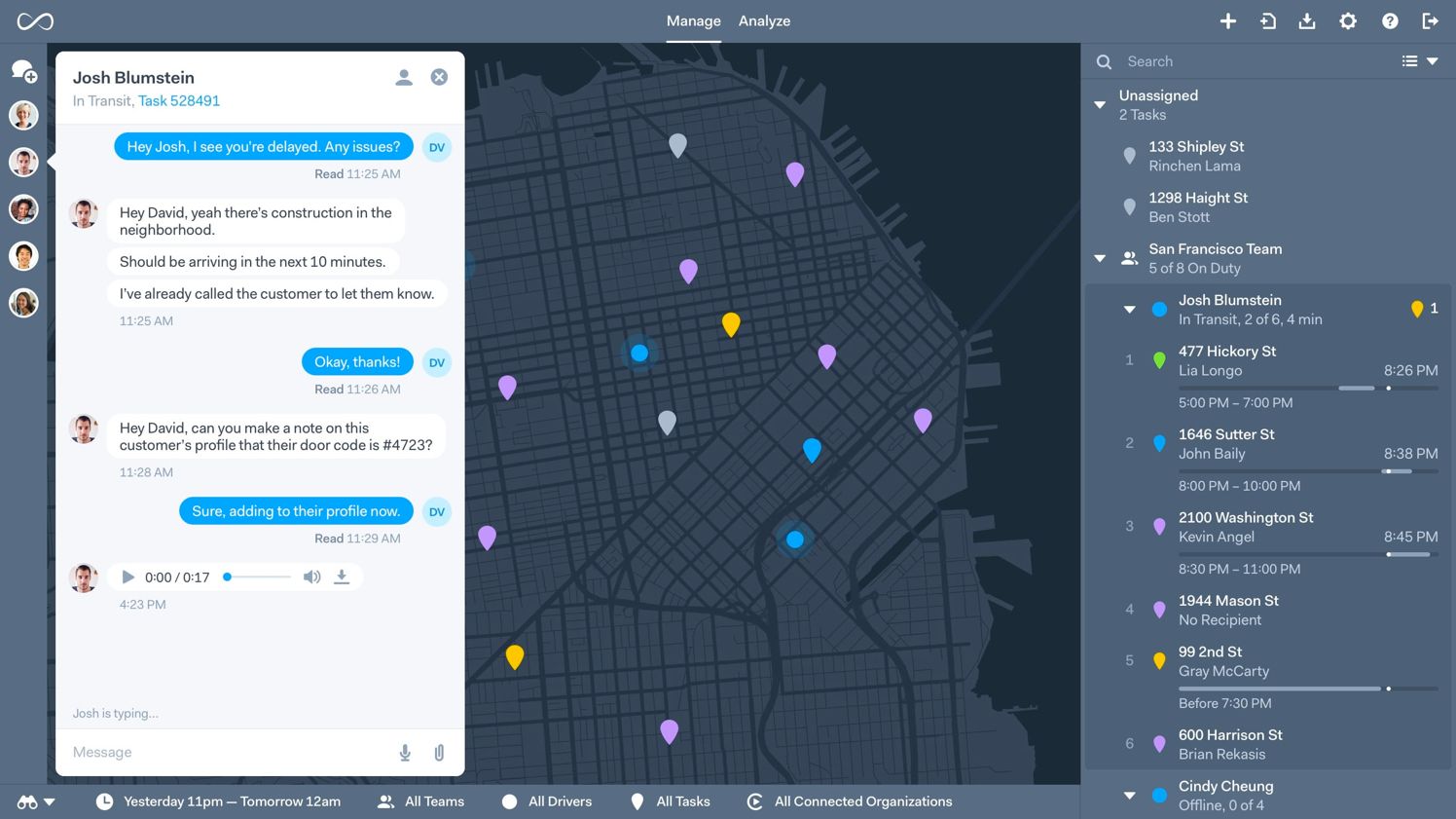 Onfleet also allows you to chat with drivers directly from the app, making it easier to understand the source of delays, and provide additional information for the delivery.