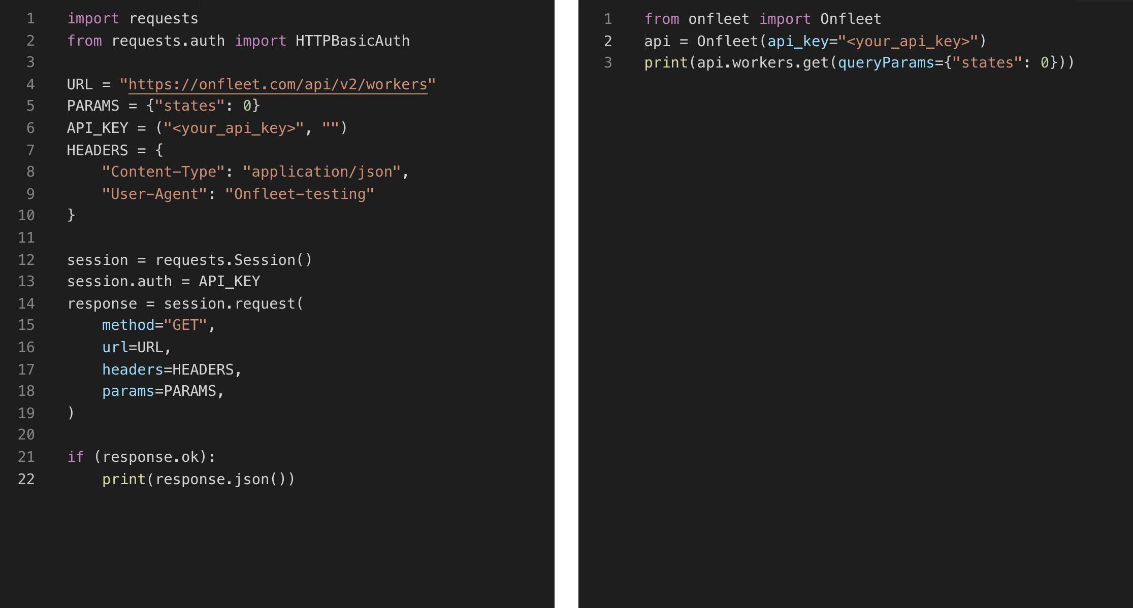 As we stated above, API wrappers can save time and allow engineers to focus on building the applications they have set out to build. As an example, take a look at a side by side comparison of the same request made via standard HTTP request and via the Onfleet wrapper: