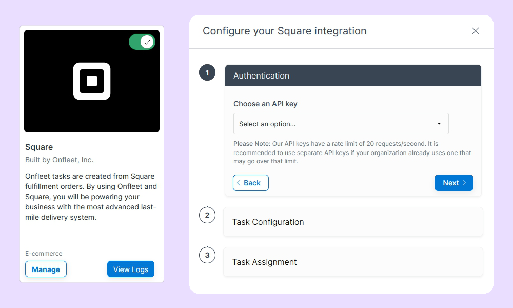 Through the Onfleet + Square integration, Onfleet tasks are created automatically from Square fulfillment orders. Configure how orders are assigned to drivers and get real-time updates on your deliveries in the Square dashboard.