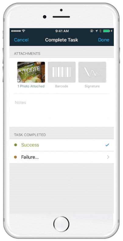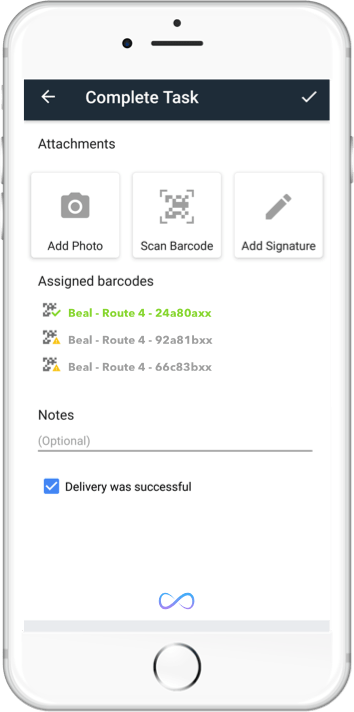 Integrating the Onfleet barcode feature through our API is simple and only requires a few additional lines of code upon task creation. The easiest way to enforce specific barcodes requirements is to create a task with requested barcodes and simply blockCompletion of the task unless the required barcodes have been scanned.