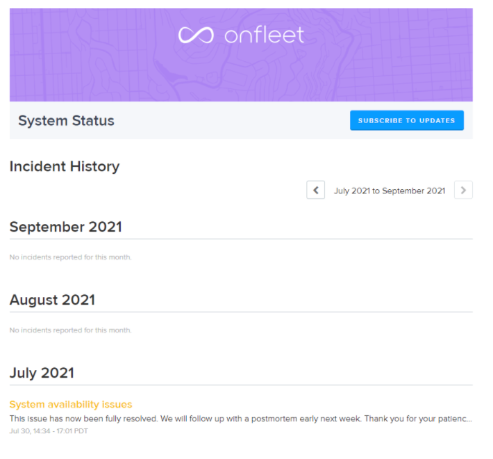 For example, Onfleet provides system performance metrics and an online incident history log. As you can see below, it’s broken down by features, making it easy to find out about maintenance or performance issues (though we try our best to avoid them).