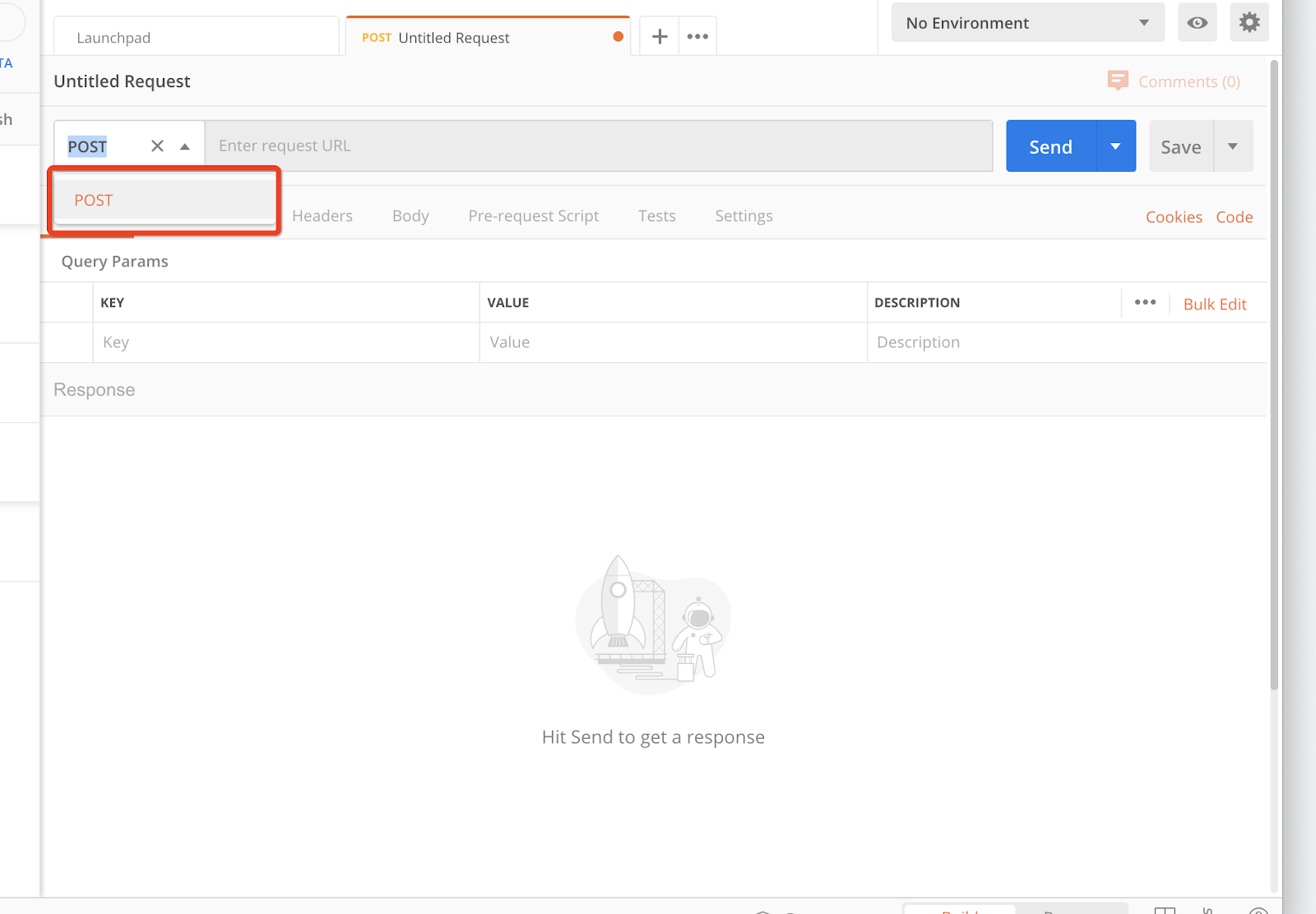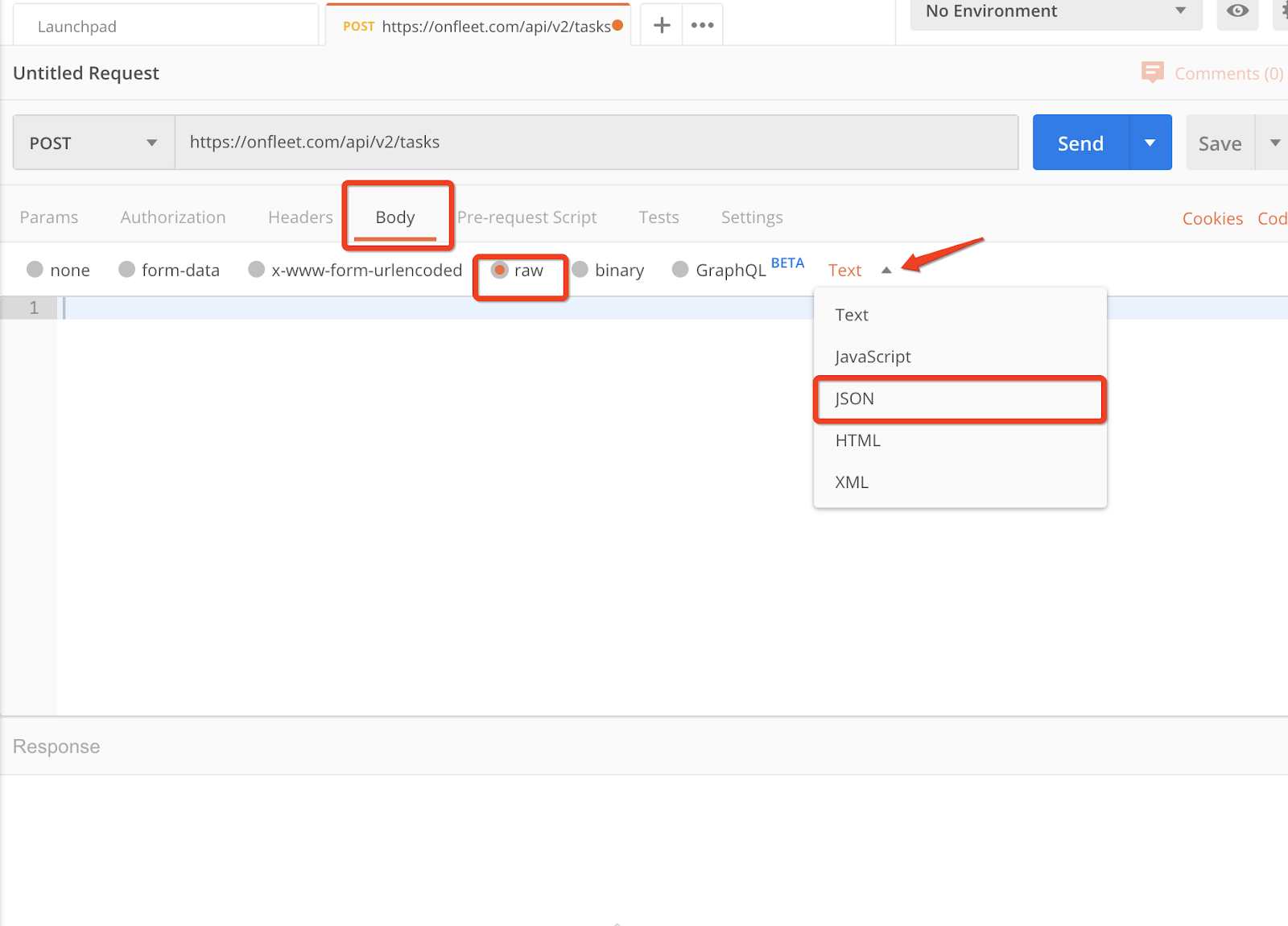 2) Since you are going to create a task - you will want to select POST from the drop down menu before you enter your request. A POST request simply means to create something on the Onfleet API under your organization’s account: