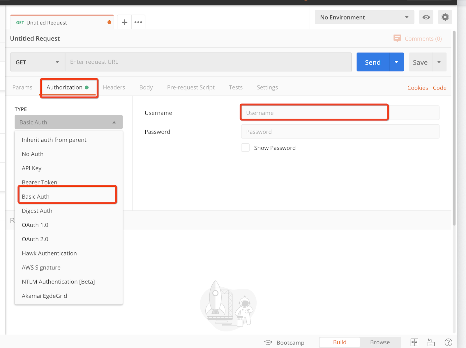 4) Now, you will need to set the Authorization to authenticate your request. Select the Authorization tab, then select Basic Auth from the drop-down (Onfleet uses Basic Authentication). Once you have selected Basic Authentication - enter your API key in the username: