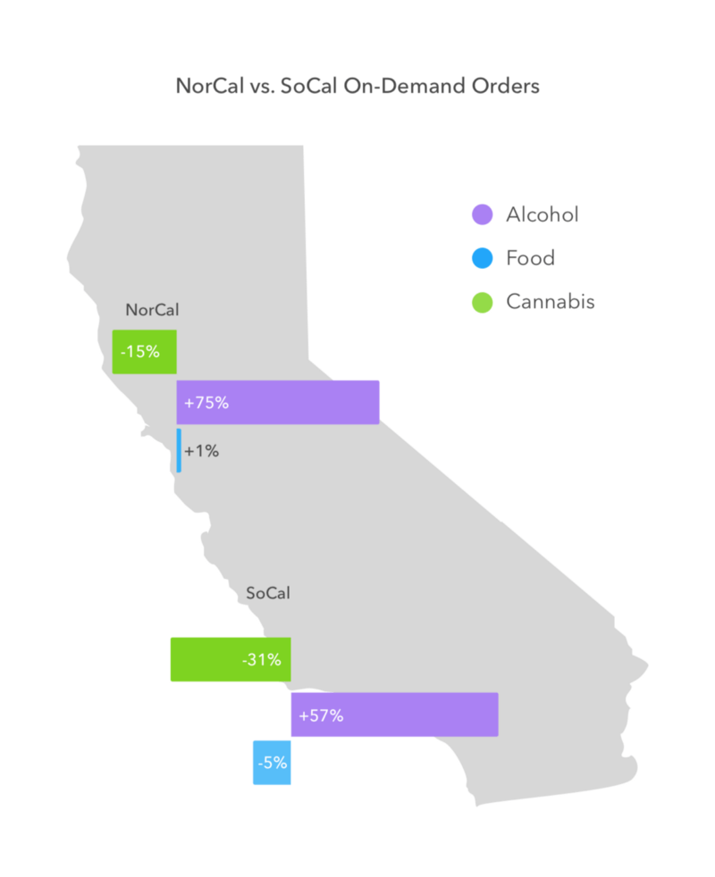 Alcohol deliveries were up by 57.3% while Food and Medical Cannabis numbers were down slightly. Comparing delivery data from Northern and Southern California, we found that northerners like to party more, with an impressive 75% increase in alcohol deliveries in NorCal, compared to a 57% increase in SoCal.