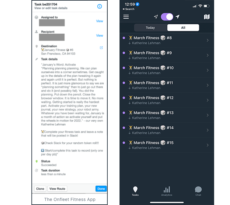 The opt-in, company-wide “Onfleet Fitness” has been a tradition and part of the team culture since before I started at Onfleet (over 3 years ago). When our former head of operations moved on, I was excited and flattered to be chosen to take the program over and keep the monthly ritual alive. The program is a fun way for Onfleeters to “drink our own champagne”, or in other words, have an opportunity to use our own mobile application, since we aren’t actually driving around our separate cities and making deliveries like our customers do.