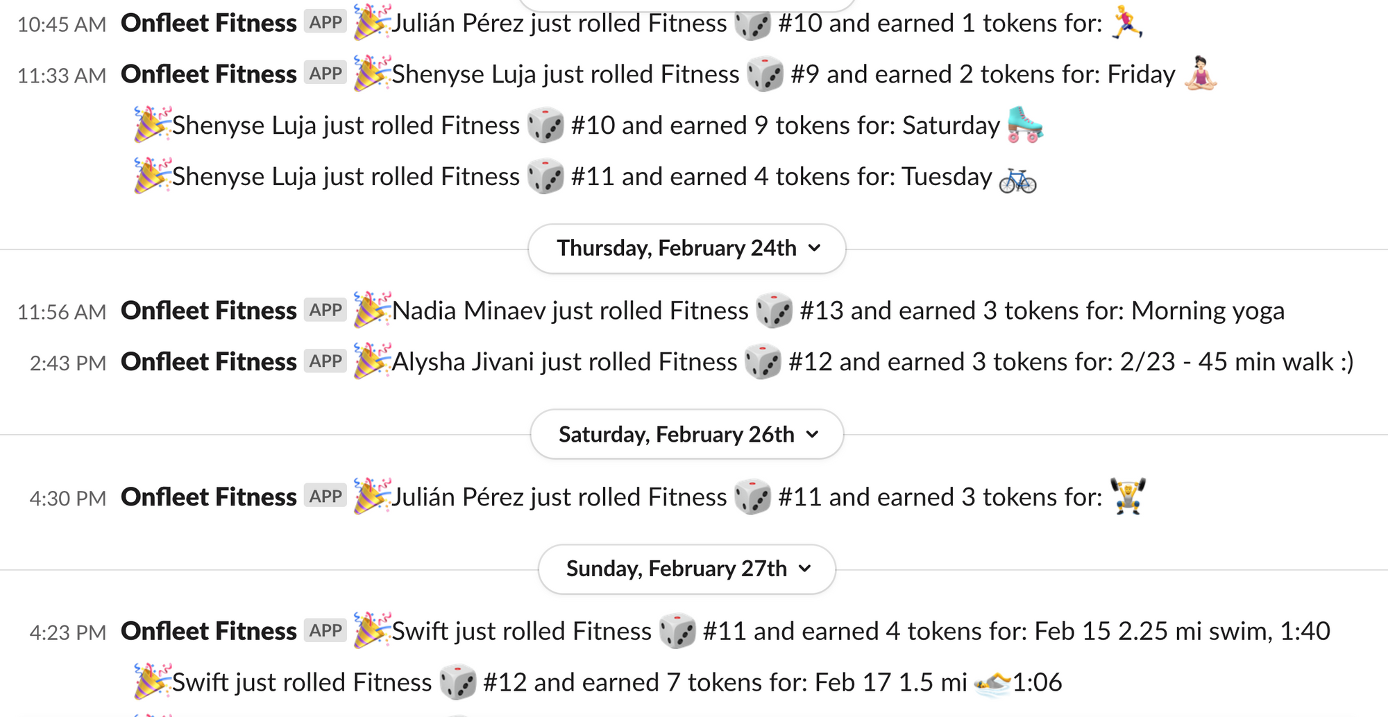 The program is predicated on completing Onfleet tasks, which are equivalent to a fitness or wellness activity (gym time, run, wilderness hike, kiteboarding, rock climbing, yoga, etc). The rules are: each Onfleeter has 15 fitness tasks that refresh month-over-month, and only one fitness task or activity can be logged for the day. A fitness task is defined as “any exercise or activity that lasts at least 30 mins in duration”. For each task that you complete in a month, you are assigned a number of tokens based on a virtual “dice roll”. These tasks show up in our #onfleet-fitness Slack channel so your teammates can cheer you on, or even join you in a virtual workout if you share a common fitness interest!
