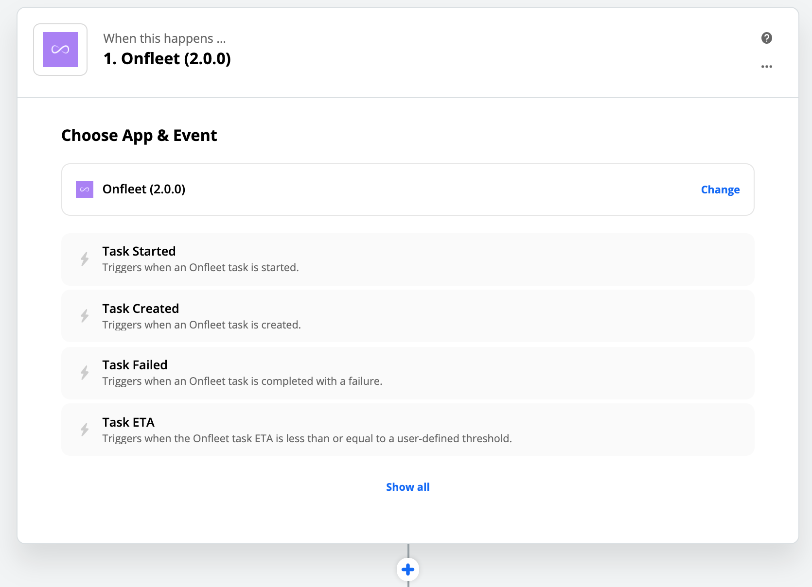 In the past, Zapier users had to use Zapier webhooks to monitor events happening within their Onfleet dashboard. The first exciting change we've made is to provide native Onfleet trigger events right within Zapier. Users can now discover these triggers by simply searching through the directory of available events.