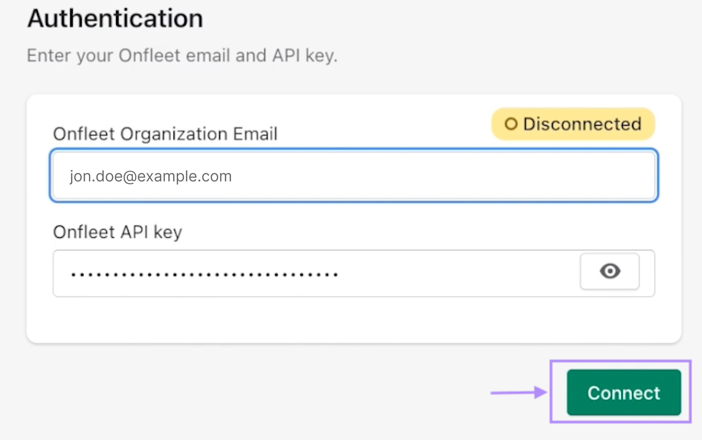 - Enter your Onfleet API key (here’s where you can find your Onfleet API key),